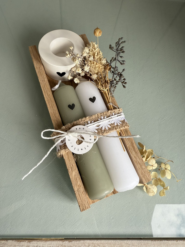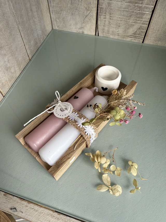 Set mit 2 Stabkerzen kurz & Kerzenhalter auf einem Holztablett, inkl. Deko
